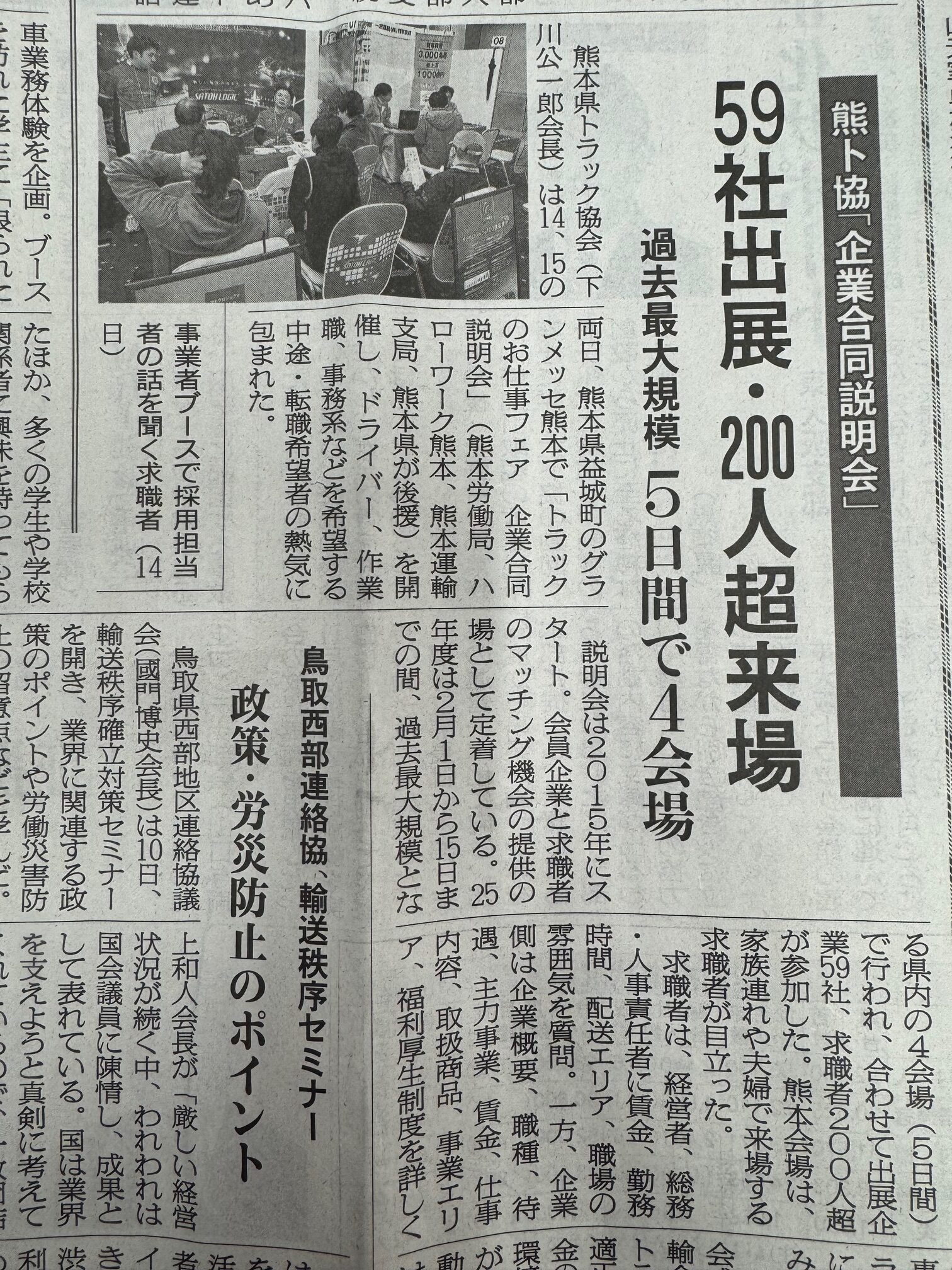 こんにちは♬先日開催されました 熊本県トラック協会主催の『トラックのお仕事フェア』の様子が、物流専門紙『物流ニッポン』に掲載されました。 記事によると、今回は県内4会場・5日間で開催され、過去最大規模となる59社が出展、 […]