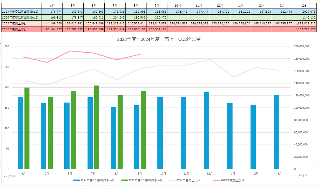 こんにちは! CO₂排出量の見える化【炭削くん】の9月分をお知らせします♪ こちらは昨年と今年のCO₂排出量と弊社の売り上げを現した表なのですが、 CO₂排出量は昨年に比べ少し増えてますが、売り上げが大幅にUPしています […]