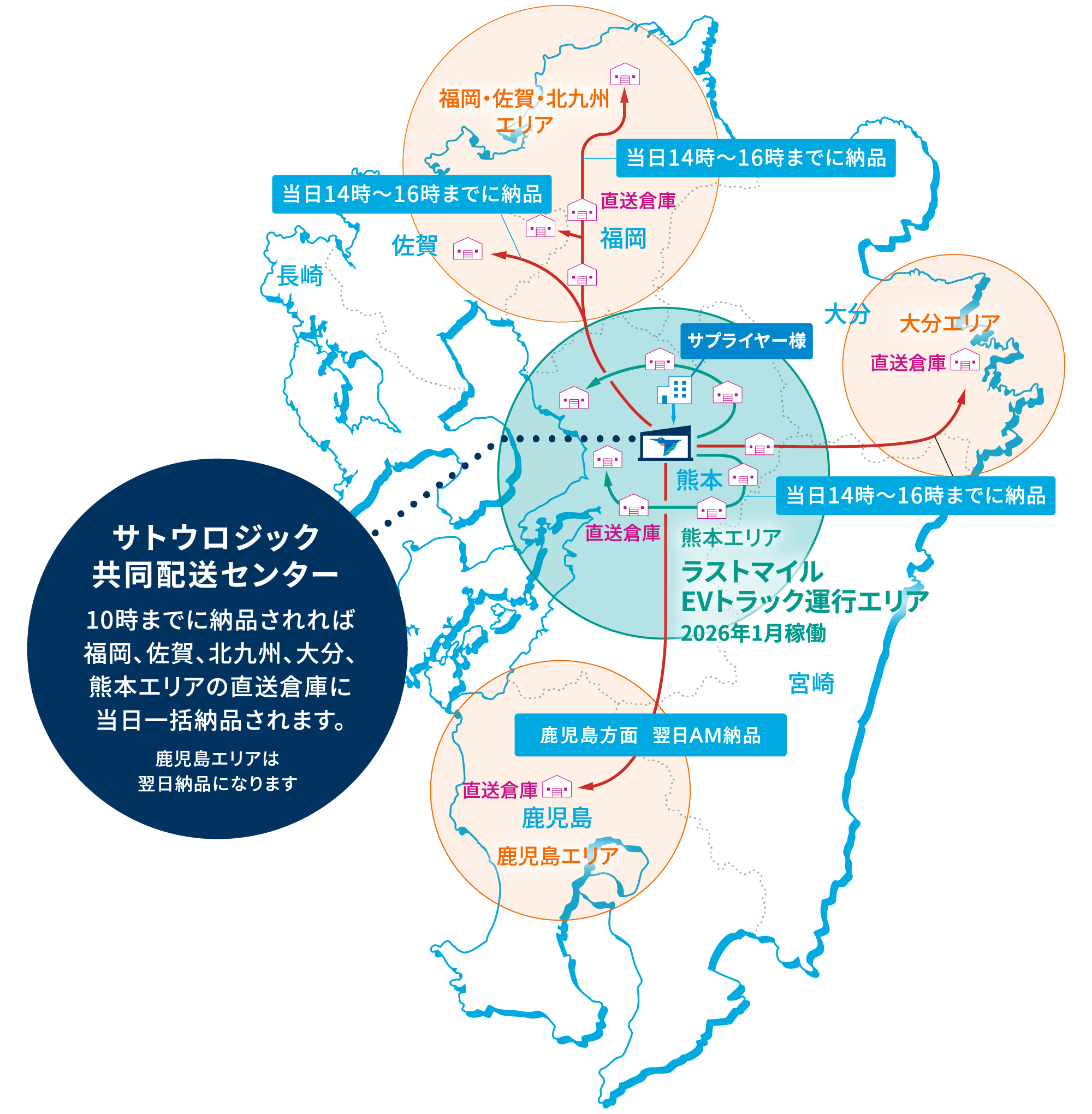 - 03AM10時までのセンター持ち込みで福岡、佐賀、大分、熊本の直送倉庫に当日納品いたします(鹿児島のみ翌日)。